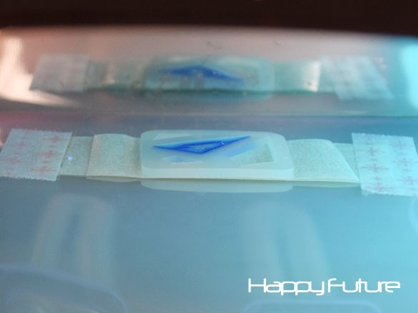 ④ 念のため裏返して裏もUVライトを照射するモールドをクリアファイルのマスキングテープからはがして裏返し