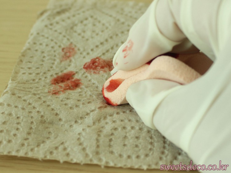 断面を塗る前に種が付いている方の面を塗っておきましょう。イチゴの断面は化粧用パフを使って着色するので必ず使い捨て手袋をはめて作業して下さい。きれいに塗るコツは、タミヤアクリルカラー (クリヤーレッド) を専用の溶剤で薄め、ぼかしながら塗ることです。